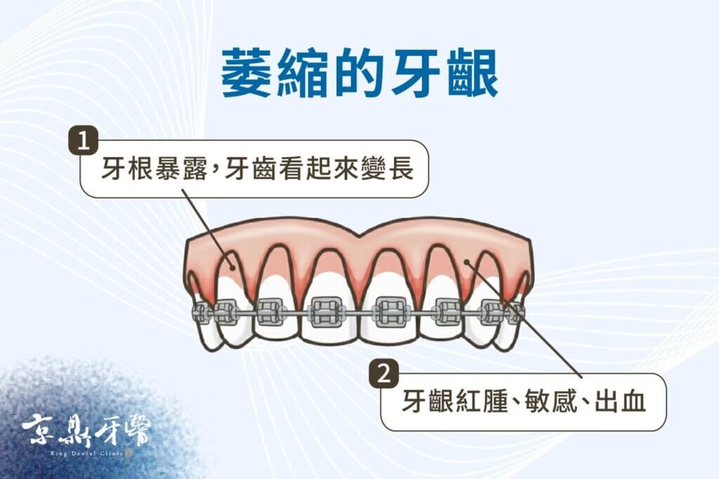 如果矯正需要大幅度改變牙齒位置(如前後或傾斜移動),會讓齒槽骨負荷增加,導致牙齦組織隨之移動或吸收,產生萎縮現象。